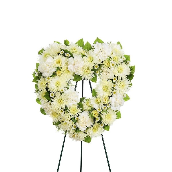 Corazón abierto, con hermosas flores blancas, y follajes verdes.