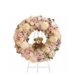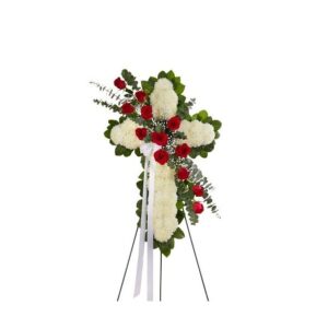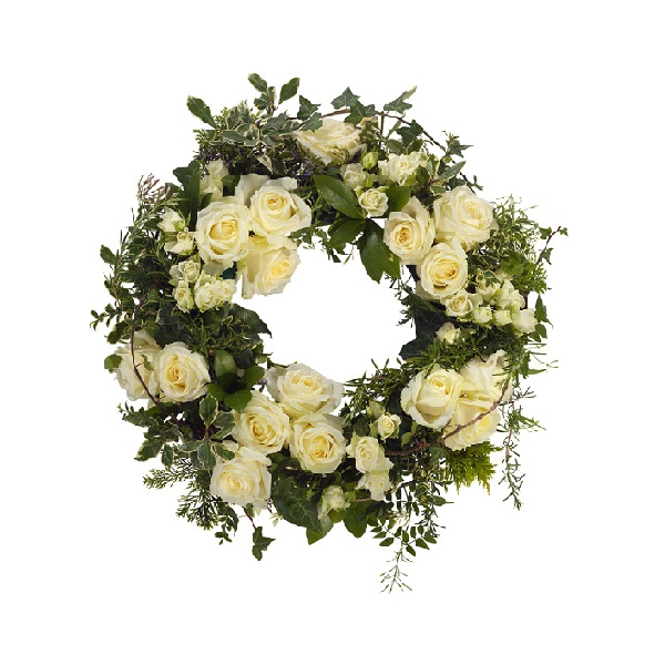 Corona, con hermosas rosas blancas, y follajes verdes.