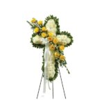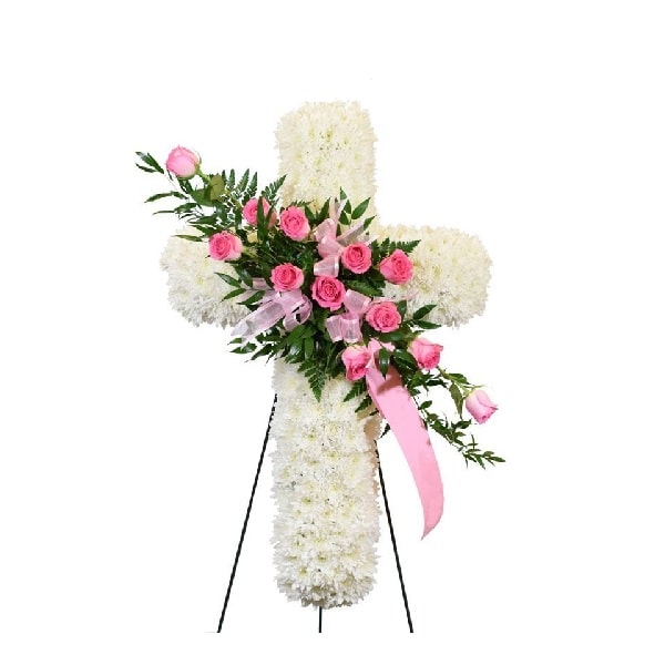 - Cruz con flores blancas y rosas rosadas, más follajes verdes.