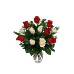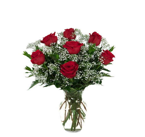 Florero con 7 rosas rojas, gypsophila + hojas verdes.