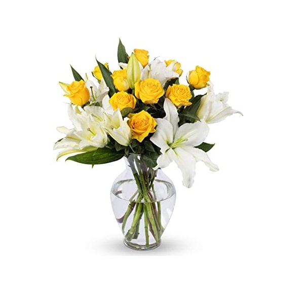 Florero con 12 rosas amarillas y 5 lilium blancos.