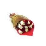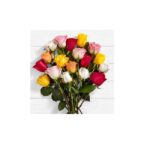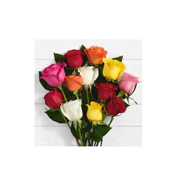- Clásico ramo de presentación con 12 rosas surtidas premium con papeles y cintas en el tono.